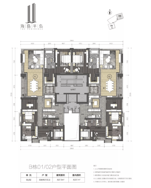 功能分区方面,海珠半岛三期做到了动静分离、干湿分明。以315㎡户型为例,该户型设计了4+1房2厅4卫,并配备了独立的工人房。四个卧室均带有独立卫生间或靠近卫生间,保证了家庭成员的隐私和便利。主卧套房设计更是奢华至极,拥有独立的衣帽间、宽敞的卫浴空间以及专属的观景阳台,让主人能够享受到帝王般的居住体验。+1房的设计则非常灵活,可以根据家庭需求改造成书房、茶室、影音室或儿童游戏区,满足了不同家庭的个性化需求。