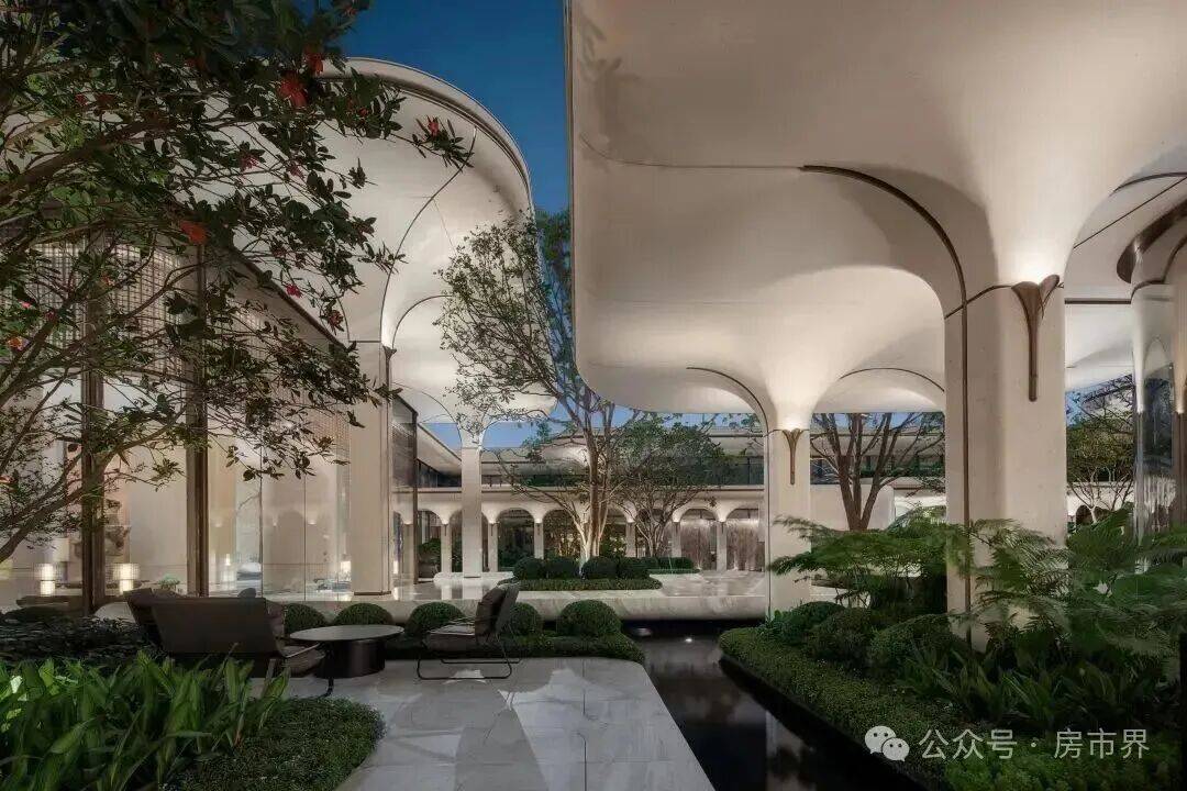 社区景观则以新加坡樟宜机场为模板,打造1.25万㎡五重“浮岛园林”,依托11米抬高的生态底盘,构建立体垂直景观体系,花草、灌木、绿植层层递进,形成都市里的热带雨林,满目绿意间尽显自然诗意。中央庭院汲取岭南“四水归堂”的传统理念,50米长单臂悬挑走廊以UHPC材质打造,环抱巨型伯爵白大理石玉盘水池,华盖星灯倒映池中,宛如“明月映玉盘”,意境悠远;树冠拱廊将地面花园与空中花园交织,漫步其中,一步一景,尽享闹中取静的惬意。更规划约7500㎡风貌商业群落,满足业主日常购物、休闲需求,足不出户即可享受便捷生活。