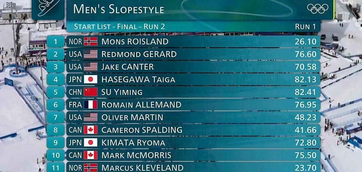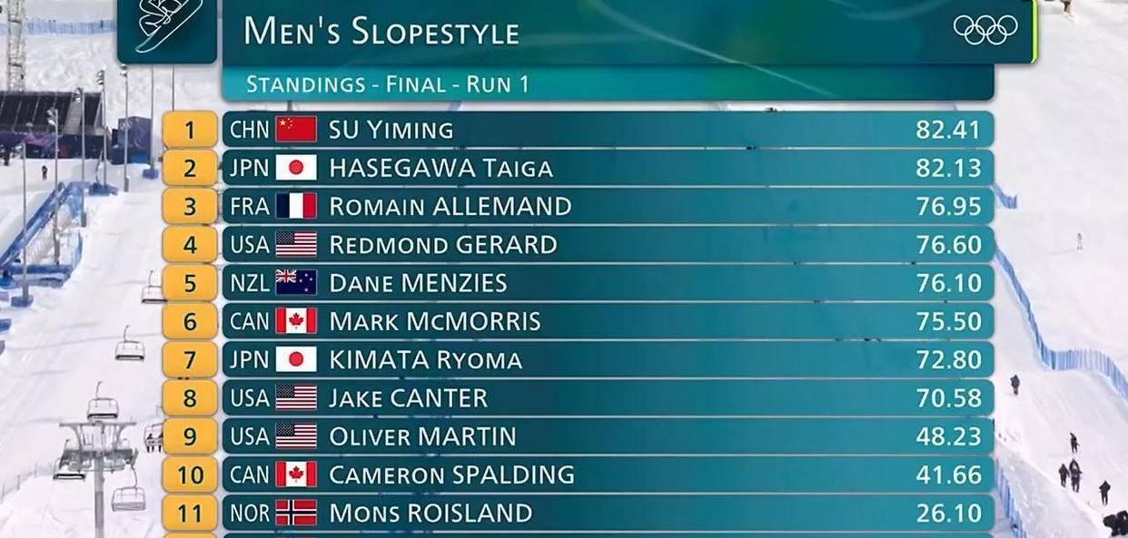 在苏翊鸣之后,其他选手陆续完成了第一轮滑行。备受关注的日本名将木俣椋真在道具区落地时出现晃动,只得到72.80分。加拿大老将麦克莫里斯拿到75.50分。挪威的克利夫兰在挑战1440动作时出现严重失误,摔倒在雪地上,仅得23.70分。预赛第一的新西兰选手门齐斯则拿到了76.10分。第一轮全部结束后,苏翊鸣以82.41分排在榜首,日本的长谷川帝胜以82.13分位列第二,法国选手阿勒芒德以78.43分排在第三。苏翊鸣占据了夺冠的有利位置,但比赛还有两轮,一切皆有可能。